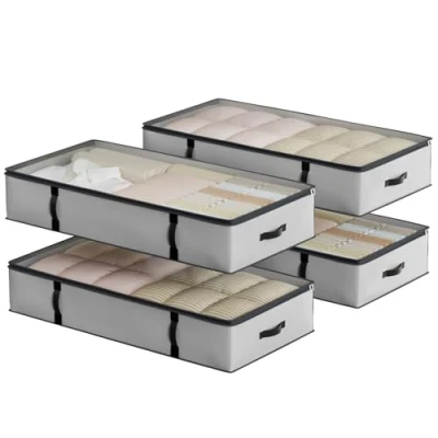 Oak & Tea Storage Bags Under Bed 90L 4 Pack, Moving Wardrobe Organiser with Lid Zips, PE Coated Woven Fabric Waterproof Box Clear Window for Clothes, Blankets, Bedding100x50x18CM
