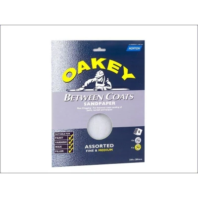 Oakey Between Coats silicon carbide sanding sheets use high-performance SG abrasive technology with a flexible fibre-reinforced backing and a No-Fil anti-clog layer. They provide smooth, consistent results when sanding and smoothing paint, plaster and filler and are suitable for wet or dry use. Sheets measure 230 x 280 mm, are Super Fine 320 grit and are supplied as a pack of 3 for hand, block or clip-fixing machine use. High-performance SG ceramic abrasive for effective material removal and consistent finish. Flexible fibre-reinforced backing for durability and tear resistance. No-Fil anti-clog layer reduces clogging to extend sheet life. Ideal for sanding and smoothing paint, plaster and filler to a fine finish. Suitable for hand sanding, sanding blocks or clip fixing machines. Supplied as a convenient pack of 3 sheets. Super Fine 320 grit designed for between-coat preparation. Large 230 x 280 mm sheets for broad coverage and fewer changes.