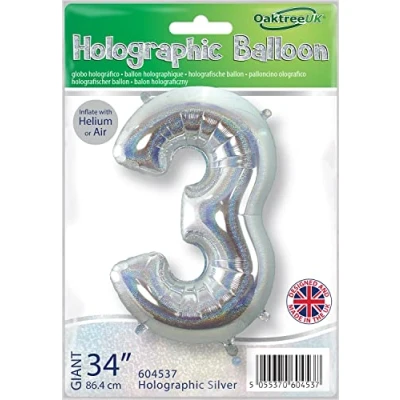 Oaktree UK 34" Number 3 Holographic Silver foil balloon 34" / 86cm when inflated with helium or air. Holographic pattern on both sides of this stunning balloon. Can be used with another Oaktree Holographic Silver Number to celebrate a milestone birthday or special occasion. UK Designed and Manufactured., Manufacturer: Oaktree UK Ltd