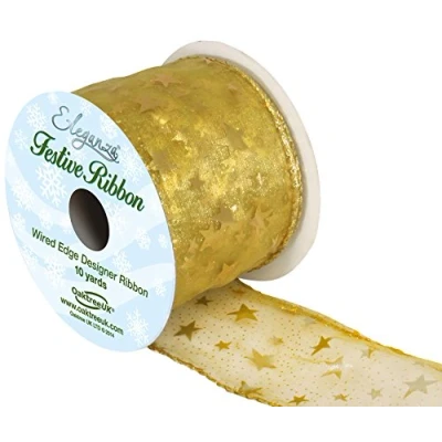 Wired Edge Designer Ribbon Gold Stars & Dots 10 yards x 63mm