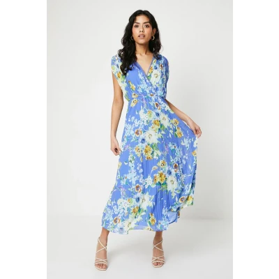 Oasis Womens Petite Occasion Floral Pleated Wrap Midaxi Dress Blue Size 10 UK