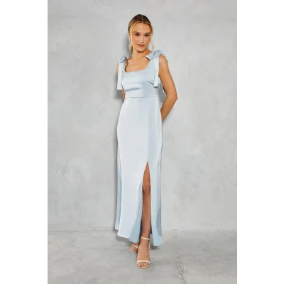 Elegant satin midi dress with charming tie shoulder detail Sophisticated square neckline for a flattering dcolletage Sleek side slit adds movement and contemporary flair Streamlined silhouette with structured bodice and flowing skirt Delicate open back design creates a graceful profile This enchanting Oasis bridesmaids dress combines timeless elegance with modern details Sophisticated square neckline for a flattering dcolletage Sleek side slit adds movement and contemporary flair Streamlined silhouette with structured bodice and flowing skirt