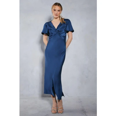 Oasis Womens Satin Twist Front Angel Sleeve Midi Bridesmaids Dress Navy Size 12 UK