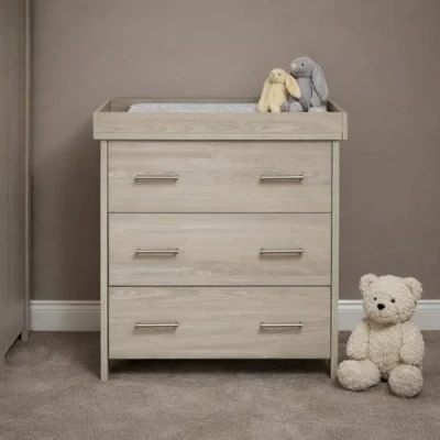 Textured oak wood effect finish Three full width, full depth 32l capacity drawers on smooth gliding, metal runners Stylish brushed metal handles Changing area accommodates a changing mat up to 76 x 46cm Discreet spring pins allow the changing area to be removed when no longer required