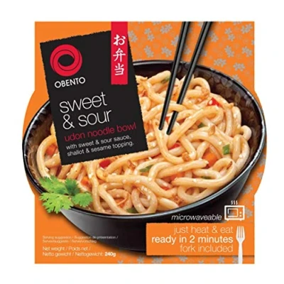 AmazonUdon pasta with sweet and sour sauce and topping of fried shallots and sesame seeds Heat & Eat: 2 minutes in the microwave and enjoy! As a meal in between or quick lunch: simple and delicious Bowl is microwave safe; fork included Quantity: 1 x 240 g