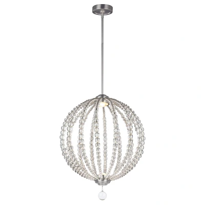 This ceiling pendant features an open frame orb shape that presents a contemporary yet timeless look. The frame is finished in sleek satin nickel, providing a polished touch that effortlessly complements various interior styles. Additionally, the design is enhanced with clear Rondure beads elegantly adorning each bar, which beautifully reflect the light as it passes through. This interplay between the beads and the illumination creates a dazzling spectacle that transforms the atmosphere of any room.
