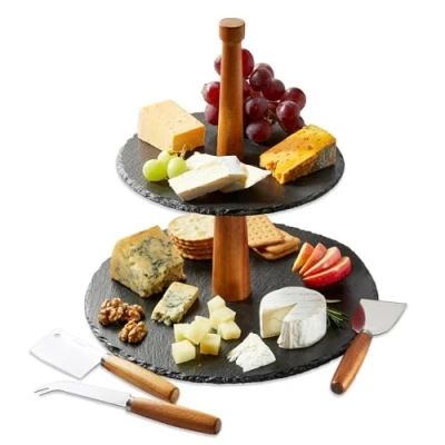 SUSTAINABLE & STYLISH; Crafted from unique, natural slate and acacia wood, our pieces offer both beauty and eco-consciousness. The cool slate naturally preserves the freshness of your cakes and cheese. EASY TO MAINTAIN: Worried about cleanup? Don't be. Natural slate is a breeze to clean and maintain, Simply wide with a damp dish cloth. VERSATILE USES: From sweet to savory, this versatile stand does it all. Display cakes, cupcakes, cheese, charcuterie, pastries, or sandwiches with style. Perfect for afternoon tea, as a cheese board, cake stand or a thoughtful gift. STUNNING KNIFE SET INCLUDED: This set includes 3 meticulously crafted knives with acacia wooden handles and stainless steel blades. These knives are specially designed for slicing and serving a variety of textures. GIFT BOXED: Beautifully presented in a branded box. A thoughtful gift for Christmas, weddings, birthdays, mothers day or couples who have everything! DIMENSIONS: 34.8 x 31 x 4.5 cm, Manufacturer: IC Innovations