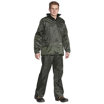 Breathable rain set. Wind and waterproof. Certificate: EN 343 3-1. Concealed hood in collar Adjustable sleeves and leg width.