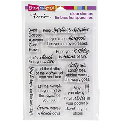 This set is full of beach-themed sentiments about life by the ocean. This Large 4 X 6 inch set of 11 Perfectly Clear Stamps features premium photopolymer images from exclusive Fran Seiford artwork. Interactive images work together for dozens of fun looks. Use with acrylic handle sold separately. Made in the USA