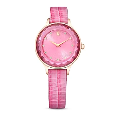 This fun 33mm watch offers ample space for you to show off your funniest side. The pink color is paired with a rose gold finish, while the complex bezel and dial are crafted from a single piece of sapphire crystal with 72 facets. The pink guilloché dial features glass hour markers and an elegant swan pattern at 12 o'clock. This Swiss Made watch is water resistant to 50m and comes with an Italian leather strap with a lizard design. Wear this vibrant timepiece as a dazzling accessory to elevate your style to the fullest. Reference: 5650030 Collection: Octea Nova Colour: Pink, Case size: 33 mm Strap length: 18 cm Material: Crystals, PVD Rose Gold Clasp Type: Buckle Strap material: Italian calfskin. Made in: Switzerland Movement: Quartz