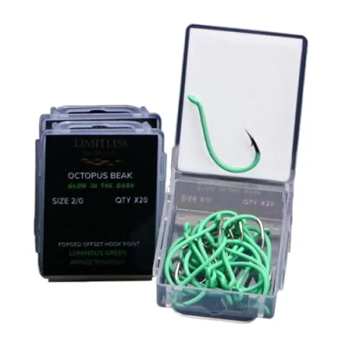 A neat addition to our GLOW products, made from a X4 Japanese high carbon steel for ultimate reliability and strength, these meaty Octopus Beak hooks will land pretty much anything in the UK waters these unique glow in the dark hooks, glow fantastically especially when charged using a UV light or your average headlamp. Ideal for targeting deep water specimen fish or the likes of smaller species in the smaller sizes 20 hooks per handy box in the following sizes 1/0, 2/0, 3/0, 4/0 and 5/0 for them big fish and baits