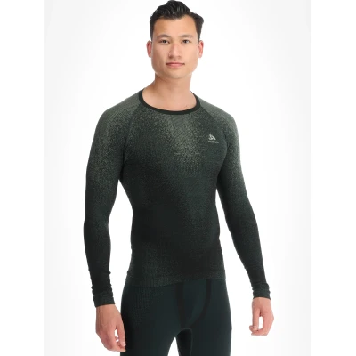 Odlo BL Top Crew Neck L/S Performance Warm Blackcomb. A men’s thermal shirt designed as a close-fitting base layer for alpine use, with a crew neck and long sleeves for full coverage. Constructed with seamless knitting to minimise chafe and reduce bulk under a midlayer or shell, this top sits close to the skin to optimise moisture transport and body heat retention. The fabric blend combines recycled polyamide, recycled polyester and recycled elastane, giving stretch for unrestricted movement and a snug fit that follows the contours of the body. Rated warmth level 3, medium warm, the Blackcomb Performance Warm sits between lightweight baselayers and heavy insulation, making it suitable for sustained activity in cool to cold conditions. The material is breathable and moves perspiration away from the skin, helping to regulate temperature during high-output skiing or hill sessions. Additional functional benefits include odour control technology, which helps maintain freshness during multi-day use, and an alpine-oriented cut that favours mobility on the slopes. The sizing is normal, with a tight fit in wear, so order your usual size for a close next-to-skin layer. This thermal top combines practical performance features with recycled materials, making it a sensible choice for skiers and winter sports enthusiasts seeking a reliable, medium-warm base layer.