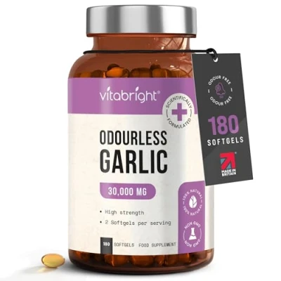 8 CLOVES OF GARLIC A DAY WITHOUT THE SMELL - Two VitaBright odourless garlic capsules a day give you all the goodness of 8 fresh garlic cloves with just 2% of the smell. Our deodourised high strength garlic extract is 500x concentrated and equals 30,000mg of fresh, raw garlic. WHY IS VITABRIGHT GARLIC BETTER THAN AGED GARLIC CAPSULES? VitaBright garlic has maximum allicin levels, so it's preferable to aged garlic capsules. Our Garlic Oil Supplement is cold pressed to preserve all the nutrients of freshly-harvested raw garlic, containing 12% to 18% Allicin (7,200mcg to 10,800mcg). By contrast, aged garlic extract is made by steeping garlic in ethanol for over a year, which destroys its allicin content. MAXIMUM ALLICIN, MAXIMUM VALUE - 180 odourless garlic tablets (softgels) per bottle. Take 1 a day for 6 months, or 2 a day for 3 months. To keep garlic supplements fresh and at full potency, store them in the fridge or somewhere cool. If you compare the strength and allicin content of our garlic tablets, you’ll see we offer a higher dose and stronger garlic supplement. PURE AND FREE FROM ADDITIVES - Our Garlic soft gels are 100% free from artificial additives, colours or flavours, gluten, lactose, or wheat and are absolutely GMO-free. The garlic pearl soft gel shell is not vegan or vegetarian. FLYING THE FLAG FOR BRITISH BUSINESS - VitaBright is a British company and our supplements are made in the UK to exacting GMP standards of cleanliness and quality control. This product proudly bears the 'Made in Britain' logo to reassure you that our supply chain and manufacturing is verified British.