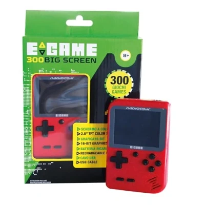PORTABLE GAMING CONSOLE: Radiocom Egame 300 Big Screen Yellow is a portable console with 300 pre-installed 16-bit + 8-bit retro style video games, perfect for portable gaming console fans and video games anywhere. FEATURES: 2.8 inch TFT color screen for a crisp and brilliant viewing experience, ideal for gaming on the go without interruption. PACKAGE CONTENTS: Includes 300 pre-installed games, easy to use English interface, built-in rechargeable battery and USB cable. Instant fun without downloading or internet connection. QUALITY AND SAFETY: Made of quality materials, sturdy and safe, compliant with regulations for portable electronic devices with 3.7V lithium battery. ODS: The ODS brand stands for innovation and quality in the electronics and video games industry, offering products dedicated to fans of portable consoles and gamesticks., Manufacturer: ODS S.r.l.