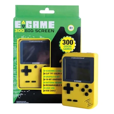 PORTABLE GAMING CONSOLE: Radiocom Egame 300 Big Screen Yellow is a portable console with 300 pre-installed 16-bit + 8-bit retro style video games, perfect for portable gaming console fans and video games anywhere. FEATURES: 2.8 inch TFT color screen for a crisp and brilliant viewing experience, ideal for gaming on the go without interruption. Package contents: the portable console with ergonomic design and compact size (16 x 7 x 2.5 cm), the built-in rechargeable battery and the USB cable for charging. Provides hours of fun without downloading or internet connection. QUALITY AND SAFETY: Made of quality materials, sturdy and safe, compliant with regulations for portable electronic devices with 3.7V lithium battery. ODS: The ODS brand stands for innovation and quality in the electronics and video games industry, offering products dedicated to fans of portable consoles and gamesticks., Manufacturer: ODS S.r.l.