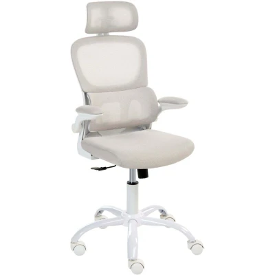 Office Chair with Padded Adjustable Armrests. Enhance your productivity with this ergonomic office chair, featuring a breathable mesh upholstery and a tilting backrest with a lock mechanism to relieve spinal tension. The iron swivel base ensures exceptional stability, while the adjustable headrest and padded armrests provide tailored support for your neck and shoulders. With its pneumatic height regulation and smooth-rolling castors, it is a versatile solution for any home office or professional open-space. Details: Product Type: Office Chair Style: Modern General Color: Beige, White Material Type: Fabric Main Material: Mesh Additional Material: Synthetic Material Legs material: Metal Seat Material: Mesh Material Composition: 100% Polyester 360 Swivel: Yes Adjustable Parts: Headrest Armrests: Yes Finish: Painted Leg Caps/ Pads: No Tilting: Yes Dimensions: Armrests Height: 15 cm Depth: 60 cm Seat Height: 40-50 cm Width: 60 cm Height: 101-111 cm Seating Surface: 50x57 cm Weight: 12 kg