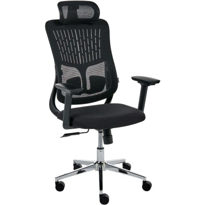 Modern Office Chair with Adjustable Backrest and Headrest. Offering a blend of flexibility and support, this executive chair suits any workspace. Upholstered in breathable mesh fabric, it promotes steady airflow, ensuring comfort and freshness during long hours of work. Adjustable headrest and armrests offer personalised customisation for optimal neck, shoulder, and arm support, while a 3-position reclining backrest and high-quality injection-moulded foam help with reducing tension and maintaining natural posture. The chair’s functionality is maximised by the pneumatic height adjustment, smooth-rolling castors, and a 360-degree swivel, ensuring easy movement and positioning. Details: Product Type: Office Chair General Color: Black, Silver Material Type: Fabric Main Material: Mesh Additional Material: Foam Legs material: Synthetic Material Seat Material: Fabric Material Composition: 100% Polyester 360 Swivel: Yes Adjustable Parts: Seat Height Armrests: Yes Finish: Powder Coated Leg