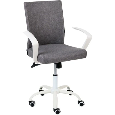 Office Chair with Adjustable Height. This ergonomic office chair perfectly balances a clean, contemporary aesthetic with the essential functions needed for a productive day at your home office desk. It stands out with a strikingly unusual, uniquely shaped armrest design, offering an architectural touch without sacrificing comfort. Easily modify the seat height and tilt the backrest to find your optimal position for extended remote work sessions. Complete with a smooth swivel function and soft upholstered surfaces, it is a highly practical and stylish upgrade for any workspace. Details: Product Type: Office Chair Style: Scandinavian General Color: Grey, White Shade: Dark Grey Material Type: Fabric Main Material: Fabric Additional Material: Plywood Legs material: Metal Seat Material: Foam Material Composition: 100% Polyester 360 Swivel: Yes Adjustable Parts: Backrest Armrests: Yes Finish: Powder Coated Leg Caps/ Pads: No Tilting: Yes Dimensions: Armrests Height: 76-86 cm Depth: 52 cm