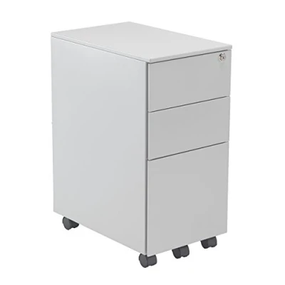 Slimline steel pedestal with 2 storage drawers and 1 filing drawer, for A4 or foolscap filing, in a contemporary silver finish Robust construction with steel drawers inners and an anti-tilt mechanism designed to withstand requirements of a busy office or home office. Backed up by a 5 year guarantee Fully lockable for safe storage of personal belongings and important documents **UPGRADED PACKAGING** No assembly required apart from fixing the castors into the base. Dimensions (W x D x H): 30 cm x 47 cm x 61.5 cm