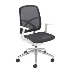 EurofficeA contemporary white-framed low back office chair with crossover frame, mesh back and seat. Supplied with fixed arms to match the frame. Discreet synchro mechanism with small levers, stylish and functional. Chrome base as standard. Black mesh seat.