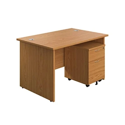This panel desk bundle offers a traditional styled desk with flexible storage that will blend into any office environment, with solid leg panels designed to conceal wires and under desk items Lockable mobile pedestal with a standard drawer and a filing drawer for foolscap or A4 filing included. Supplied with 2 sets of keys Integrated cable ports, metal to metal fixings for strength and adjustable feet for levelling on uneven floors. Heat and stain resistant finish 5 year component guarantee Desk Dimensions (W x D x H): 120 x 80 x 73 cm. Pedestal Dimensions (W x D x H): 40.4 x 50 x 69.5 cm