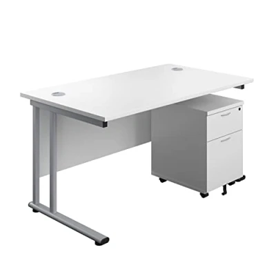 Office Hippo Professional Cantilever Desk With 2 Drawer Mobile Pedestal, Wood, White, Silver Frame, 140 x 80 73 cm