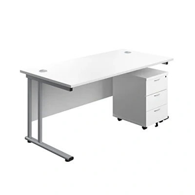 Office Hippo Professional Cantilever Desk With 3 Drawer Mobile Pedestal, Wood, White, Silver Frame, 160 x 80 73 cm