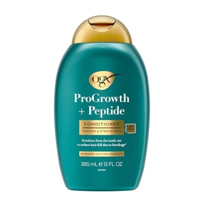 THICKEN & STRENGTHEN: This OGX ProGrowth + Peptide Conditioner nourishes and helps reinforce hair from the inside out to help reduce hair fall due to breakage*. Visibly thicker strands after 1st use* HAIR FALL DEFENCE: This strengthening conditioner helps reduce hair fall caused by breakage* while supporting your natural hair growth with every wash. Developed with trichologists, it helps thicken strands, strengthen hair, and maintain lengths PEPTIDE INGREDIENT: Developed with trichologists, this conditioner is formulated with peptides and carefully selected moisturising agents. With Lipi Pro Shield Technology, this formula helps thicken & strengthen your lengths from the inside out NOURISHING CONDITIONER: Made with sulfate-free surfactants, this nourishing conditioner supports your natural hair growth with every wash. 81% agree hair feels thicker after 30 days** HOW TO USE: After shampooing, apply to mid lengths & ends, wait 3-5 minutes. Rinse out. For best results, use with complete OGX ProGrowth + Peptide range for visibly thicker, fuller hair from the root*