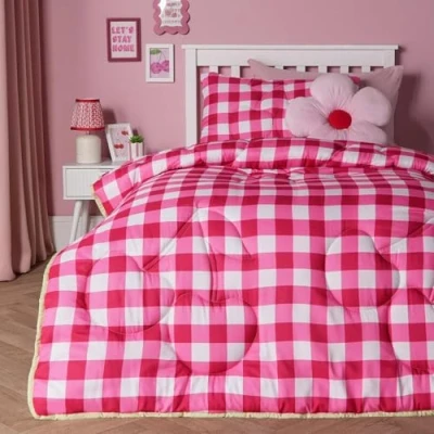 Double Coverless Duvet: All year round microfibre coverless duvet soft touch, cosy and comfy providing a restful sleeping experience, night after night. Reversible summer duvet double featuring red gingham cherry design. 200 x 200cm: Coverless double duvet quilt sized for double beds, camping tents or as a travel duvet. Includes two matching pillowcases sized 48 x 74cm. Coverless duvet double 7.5 tog bedding UK size. Red gingham cherry reversible coverless duvet with double pillowcases. Double bed duvet with panel style textured microfibre coverless quilt. Super soft 7.5 tog double duvet styled perfectly for any girls bedroom design. Coverless duvet 7.5 tog ideal for use as a summer quilted duvet or winter duvet. Reversible red gingham coverless quilt perfect for on the go as camping bedding or travel quilt. Breathable microfibre material provides soft touch against skin and a restful nights sleep. Valentines day gifts or gifts for her will love all year round. Super soft coverless quilts double 7.5 tog made from breathable 100% microfibre polyester filling and 95gsm. Washable summer quilts double is easy to care for and can be machine washable.