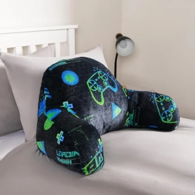 Gamer Cushions for Boys: Sit up pillow for bed offers numerous health and well-being benefits for your kids while providing a comfy relaxing seat. Support cushion ensure a relaxing and stress free fluffy pillow your kids will love in gaming bedroom. Improve kids posture as they game, read or watch TV with soft and comfy teddy snuggle cushion that supports natural curvature of their spine. Fleece pillow for bed, sofa or floor is perfect for kids who want to relax in ultimate comfort. Kids snuggle pillow with arms is ideal for kids who love reading, watching films, social media scrolling, gaming, or even doing homework in a comfy back cushion position. Versatile kids back pillow is great for relaxing anywhere in the house. Christmas gifts for kids, girls and boys of all ages. Treat your kids, friends or family to the ultimate comfort with fleece armchair pillow, great for reading, gaming and more. Size 45cm x 40cm x 30cm. Black gaming pillow featuring neon space, controllers, and shapes. Super soft fleece backrest pillow made from 100% soft polyester lining and hollowfibre filling. Spot Clean Only. Plump, shake and leave for 24 hours after unpacking.