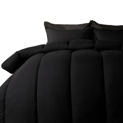 Coverless Duvet Double: The timeless black colour adds a touch of softness and warmth to your bedroom decor, easily blending with various styles to create a serene, inviting atmosphere. This double duvet innovative coverless design eliminates the need for extra bed linens, making it quicker and easier to set up and maintain. 200 x 200cm: This set includes a double coverless duvet and 2 matching pillowcases 50 x 75cm, giving you everything you need for a cohesive and comfortable bedding experience. Lightweight and compact, this double duvet is perfect for camping trips or travel All-Season Comfort: The double coverless duvet offers a perfect balance of warmth and breathability with its 10.5 Tog rating, making it suitable for both summer and winter use. Stay cosy year-round without overheating or feeling too cold. Soft & Cosy Microfibre Fabric: Crafted from high-quality 100% polyester microfibre, this coverless duvet feels luxuriously soft against your skin. The fabric's gentle texture enhances comfort, providing a restful night’s sleep every time. Easy Care & Washable: Designed for convenience, this double duvet and its matching pillowcase are fully machine washable, making it easy to maintain a fresh and clean bedding setup with minimal effort.