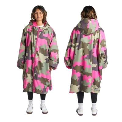 Waterproof Coat Womens: Stand out in style with the trendy camouflage pattern in green and pink. The dry robe combines a bold, modern look with functional rain protection, perfect for the fashion-forward outdoor enthusiast. Privacy Robe for Easy Changing: The womens rain coat oversized relaxed fit allows for easy discreet changing with plenty of room to move. Perfect for when you need to change in privacy or simply lounge comfortably after outdoor adventures. Size: Length 109cm x 89cm Width. Convenient Hood & Pockets: The changing robe equipped with a spacious hood to protect your head from the elements and large pockets to store essentials like your phone, keys or towel, this drying robe offers both style and functionality. Cosy Fleece Lining for Warmth: The soft sherpa fleece lining provides extra warmth, making it perfect for cooler weather or after-water activities. Stay comfortable and snug, whether you're changing outdoors or simply staying cosy on the go. Waterproof & Windproof Protection: Stay dry and comfortable with this waterproof coat womens. Its high-quality material ensures you stay shielded from rain and wind, making it ideal for outdoor activities like surfing, swimming or lounging. The waterproof jacket is durable, made from 100% polyester with 155gsm oxford and 180gsm teddy. Easy care is simply machine wash at 40°C cold and air dry to keep it fresh and ready for your next outing.