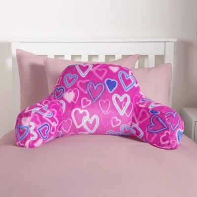Children's Cuddle cushion for Kids: Sit up pillow for bed offers numerous health and well-being benefits for your kids while providing a comfy relaxing seat. Support cushion ensure a relaxing and stress free fluffy pillow your kids will love. Improve kids posture as they game, read or watch TV with soft and comfy teddy snuggle cushion that supports natural curvature of their spine. Soft fleece back support reading pillow for bed, sofa or floor is perfect for kids who want to relax in ultimate comfort. Bed rest pillow with arms is ideal for kids who love reading, watching films, social media scrolling, gaming, or even doing homework in a comfy back cushion position. Versatile gaming pillow is great for relaxing anywhere in the house. Christmas gifts for girls and boys of all ages. Treat your kids, friends or family to the ultimate comfort with fleece armchair pillow, great for reading, gaming and more. Size 45cm x 40cm x 30cm. Pink reading cushion featuring various sized and coloured hearts. Fleece back support cushion for bed made from 100% soft polyester lining and hollowfibre filling. Spot Clean Only. Plump, shake and leave for 24 hours after unpacking.