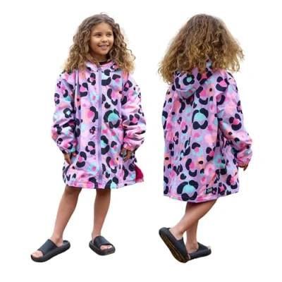Waterproof Changing Robe for Kids: This stylish lilac purple shade leopard print changing robe combines fun and fashion, making it a perfect choice for girls who want to stand out while changing at the beach, pool or after surfing. Oversized Fit for Easy Changing: The swimming robe is designed with an oversized fit, this changing robe provides ample space for easy and private changing, ensuring comfort and freedom of movement while keeping your child cosy and covered. Size: Length 86cm x Wide 72cm. Practical Features for Convenience: The kids changing robe is equipped with a spacious hood to keep their head warm and dry and large pockets to store essentials like towels, snacks or small toys, this changing robe offers both style and functionality. Soft Fleece Lining for Extra Comfort: The ultra soft cosy fleece lining interior provides cosy warmth, keeping your child comfortable during cooler weather, whether they're lounging, changing or just relaxing after water sports. Waterproof & Windproof Protection: Made with waterproof fabric, this changing robe ensures your child stays dry and protected from the elements, making it perfect for outdoor activities like swimming, surfing and beach days. The swimming robe is durable, made from 100% polyester and easy care is simply machine wash cold and air dry to keep it fresh and ready for your next outing.
