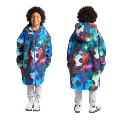 Kids Dry Robe: Featuring a bold neon colour with playful football design, this waterproof changing robe is designed for both boys and girls, ensuring they stay stylish and easy to spot during outdoor activities like beach trips, surfing, or football. Lightweight & Breathable: Made with lightweight, breathable materials, this boys waterproof jacket allows for easy movement and airflow, ensuring your child stays comfortable and cool even during active play or long outings. Size: Length 72cm x Width 64cm. Practical Features for Active Kids: The kids changing robe is equipped with an spacious hood, secure zip closure and large pockets, this rain coat jacket offers functional features that help keep your child’s hands warm and their essentials safe while they explore outdoors. Cosy Fleece Lining for Comfort: The soft sherpa fleece lining ensures warmth and comfort, making it an ideal option for after swimming, surfing, or playing outdoor sports in cooler weather. Your child will stay cosy while they dry off. The dry robe is designed for busy kids and parents, this packable waterproof jacket folds down easily, making it perfect for travel or to toss in a backpack when you're on the go, ready for any unexpected weather changes. Waterproof & Wind Resistant: Crafted with waterproof fabric and wind-resistant technology, this changing robe keeps kids dry and protected, ensuring they stay comfortable during outdoor adventures, whether it’s raining or windy. The waterproof robe is durable, made from 100% polyester with 155gsm oxford and 180gsm teddy. Easy care is simply machine wash at 40°C cold and air dry to keep it fresh and ready for your next outing.