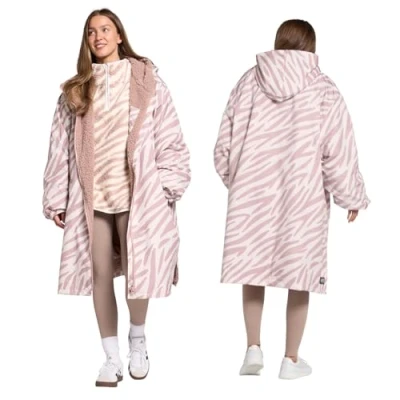 Waterproof Coat Womens: Waterproof outer shell keeps rain and wind out, while the chic zebra print and neutral beige tone add a fashionable edge to your outdoor look. Perfect for walking, commuting, festivals, swimming and travel. Privacy Robe for Easy Changing: The womens rain coat oversized relaxed fit allows for easy discreet changing with plenty of room to move. Perfect for when you need to change in privacy or simply lounge comfortably after outdoor adventures. Size: Length 105cm x 80cm Width. Convenient Hood & Pockets: The long rain coats for women waterproof equipped with a spacious hood to protect your head from the elements and large pockets to store essentials like your phone, keys or towel, this women raincoat offers both style and functionality. Soft Fleece Lining for Warmth: The cosy sherpa fleece lining adds an extra layer of warmth, making it perfect for cooler weather or transitioning out of swimwear. Stay comfortable and dry, whether you're changing at the beach or heading to a rainy outdoor event. Waterproof & Windproof Protection: Stay dry and comfortable with this waterproof changing robe. Its high-quality material ensures you stay shielded from rain and wind, making it ideal for outdoor activities like surfing, swimming or lounging. The dry robe is durable, made from 100% polyester with 155gsm oxford and 180gsm teddy. Easy care is simply machine wash at 40°C cold and air dry to keep it fresh and ready for your next outing.