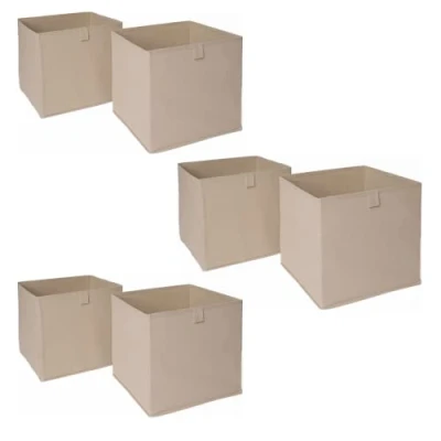 Organise and tidy with our set of 6, durable fabric storage boxes, perfect to store toys, shoes or clothes. This item is a pop up lightweight storage solution and has been crafted with card lining making this sturdy and durable. Colour: Beige. Matching handy loop, allows for easy, pull out and pushback. Size: Square - 27cm Height, 27cm Depth, 27cm Width. Ideal for bookcase storage, whilst being collapsible Material: 100% Polyester, with cardboard base and sides Included: 6 x Storage Boxes. Care Instructions: Wipe clean with damp cloth. Can be folded and stored.