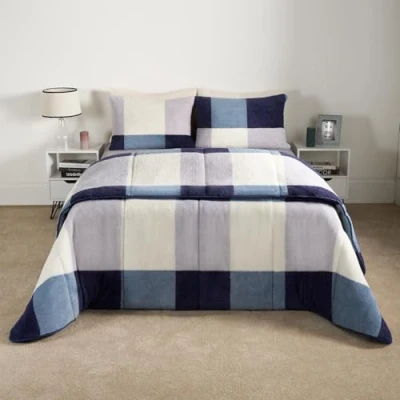 OHS Teddy Coverless Quilt Double 10.5 Tog, Gingham Fleece Duvet Washable Camping Winter Soft Warm Comfy Bedding with Pillowcases Navy