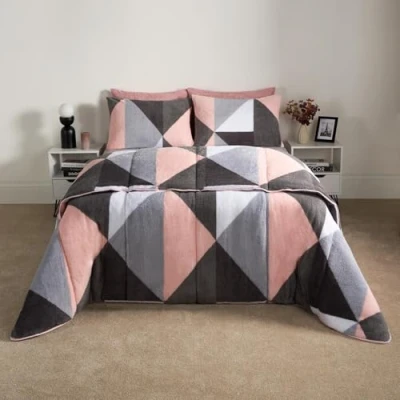 Camping Quilt Double: Reversible summer and winter duvet double is soft touch, cosy and comfy providing a restful sleeping experience, night after night. Reversible coverless duvet double 10.5 tog featuring blush pink geometric shapes design. Coverless Duvets Double: 200cm x 200cm: 10.5 tog duvet double sized for beds, large camping tents or as a travel duvet. Includes matching pillowcase sized 50 x 75cm. Teddy coverless duvet double 10.5 tog set bedding UK size. Blush pink geometric shapes duvet coverless bed set with reversible design for any style. Camping duvet double with textured reversible design, ideal for adding a touch of class to your bedroom, featuring pink shapes quilt duvet. 10.5 tog double coverless duvet ideal as a winter duvet double. Bear fleece coverless duvet 10.5 tog perfect for holidays, travelling, as a camping quilt or travel duvet. Breathable soft touch microfibre coverless quilt ensures restful nights sleep. Soft and warm duvet double with matching pillowcase made from soft 100% teddy fleece and 150gsm. Washable quilt coverless is easy care and can be machine washed at 40°C.