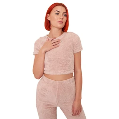 OHS Teddy Fleece Crop Top Short Sleeve Warm Soft T Shirt Plain Pullover Casual Womens Loungewear, Blush Pink Medium 10/12