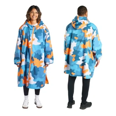 Dry Robes Adult Mens: Featuring a striking blue and orange camouflage pattern, this waterproof changing robe is perfect for both women and men, offering a stylish and unisex design for all outdoor adventures. Privacy Robe for Easy Changing: The womens raincoat waterproof oversized relaxed fit allows for easy discreet changing with plenty of room to move. Perfect for when you need to change in privacy or simply lounge comfortably after outdoor adventures. Size: Length 109cm x 89cm Width. Convenient Hood & Pockets: The changing robe equipped with a spacious hood to protect your head from the elements and large pockets to store essentials like your phone, keys or towel, this beach robe offers both style and functionality. Cosy Fleece Lining for Warmth: The soft sherpa fleece lining provides extra warmth, making it perfect for cooler weather or after-water activities. Stay comfortable and snug, whether you're changing outdoors or simply staying cosy on the go. Waterproof & Windproof Protection: Stay dry and comfortable with this waterproof coat womens. Its high-quality material ensures you stay shielded from rain and wind, making it ideal for outdoor activities like surfing, swimming or lounging. The waterproof jacket is durable, made from 100% polyester with 155gsm oxford and 180gsm teddy. Easy care is simply machine wash at 40°C cold and air dry to keep it fresh and ready for your next outing.