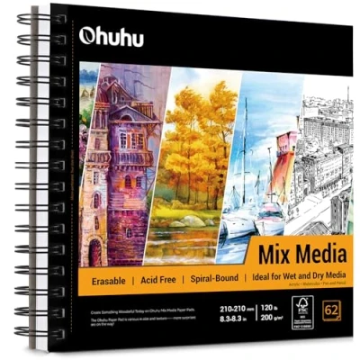Premium 200gsm Acid-Free Paper: This heavyweight mixed-media sketchbook features high-quality 200gsm paper that withstands watercolours, acrylics, and markers without bleeding or warping. The acid-free composition prevents yellowing, preserving your artwork for years. Premium 8.9x8.3" Square Format (Trims to 8.3x8.3" ): Break free from standard rectangular sketchbooks with this perfectly Ohuhu sketchbook for markers. The balanced 21cm x 21cm dimensions offer 15% more drawing area than A5 while maintaining ultra-portability – slips easily into backpacks and tote bags. Mixed Media Sketchbook – Engineered to excel with both wet and dry media: Watercolours blend smoothly without pilling, alcohol markers show true colours without bleeding through, while charcoal and pastels adhere beautifully. The paper's optimal weight (200 gsm) handles acrylic layering while remaining workable. Artist-Focused Spiral Binding & Perforations: The durable lay-flat spiral binding works equally well for right and left-handed artists. Micro-perforated pages remove cleanly without damaging your artwork. The hardback cover provides sturdy support for outdoor sketching, making it ideal for UK art students and urban sketchers. Bonus Protective Writing Mat: Though the paper is strong and thick enough to prevent any bleeding, you can also place the soft writing mat between the paper to keep your pad in good condition anytime when you are drawing. Perfect gift choice for both children and adults at Christmas, birthdays, and more!