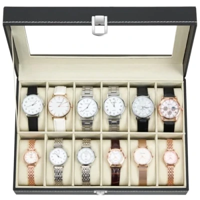 Ohuhu Watch Box with 12 Slots, Case Glass Lid, PU Leather Holder Velvet Pillows, Storage for Men and Women, Gift Idea Birthday Father's Day Christmas