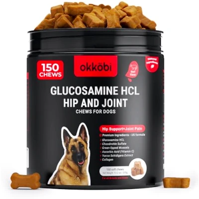 OKKÖBI Glucosamine HCL & Hip and Joint Chews for dogs 150 pcs Advanced Support Vet approved US Formula with MSM Green Lipped Mussel Beef