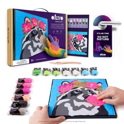 OKTO Paint by Numbers for Children Kid's Kits with Air Dry Clay, Unique 2D Wall Art, Sensory Canvas Raccoon Themed, Framed Animal Art Kit Age 5+