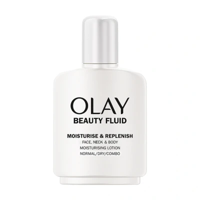 Olay Beauty Fluid Moisturise&Replenish Face, Neck and Body Lotion (200 ml) is a lightweight, non-greasy moisturizer providing 24-hour hydration and a silky soft feel, suitable for the face, neck, and body, and ideal as a makeup base with classic moisture lock technology.