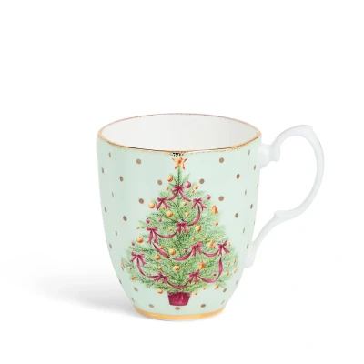 Sip in festive style with our Old Country Roses Christmas Mug. Crafted from bone china, this elegant mug features our iconic ribbon-adorned Christmas tree motif, set against a soft fern green backdrop, accented with golden polka dots. With stippled gold banding for that extra special touch, the rim and handle are beautifully detailed to elevate your holiday moments. Beautifully packaged in a pink Royal Albert gift box, finished with a charming label adorned with delicate hints of festive foliage, echoing the timeless elegance of the collection, itâs a thoughtful gift or a festive indulgence for yourself.