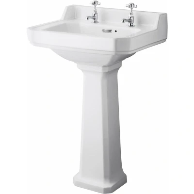 Old London Milano Richmond Traditional White Ceramic Bathroom Basin Sink with Full Pedestal and Two Tap Holes 560mm x 450mm