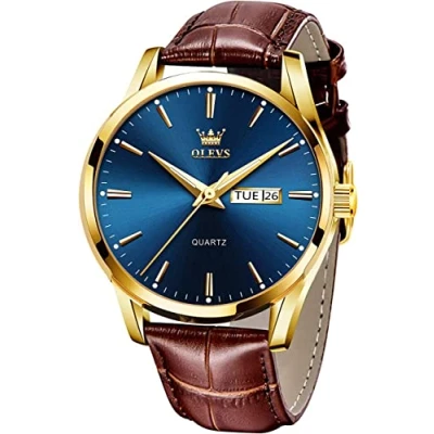 OLEVS Men Watches Black/Blue/White Dial Classic Analog Quartz Watch Week Date Casual Luminous Brown Leather 3ATM Waterproof Wrist for