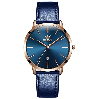 OLEVS Women Wrist Watches Ultra Thin 6.5mm Minimalist Business Dress Waterproof Date Blue Leather Face Strap Slim for